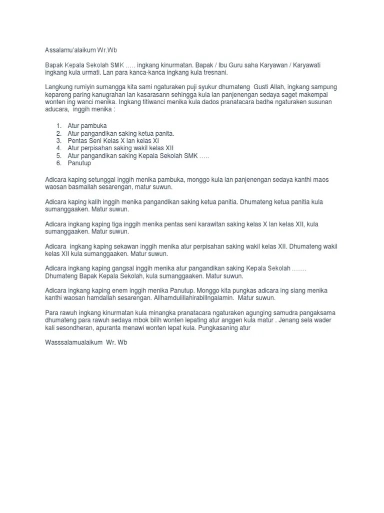 Hadlrotal mukarrom poro alim ulama' poro kyai ingkang satuhu dahat kinurmatan. Berikut ini contoh pronotocoro (dirumah penganten pria ) sederhana yang bisa anda gunakan untuk pemula. Contoh teks mc bahasa jawa acara mantenan pernikahan dan dapat dimodifikasi untuk pembawa acara ngunduh mantu menggunakan bahasa jawa halus kromo inggil. Pranatacara/pranata adicara pengantin nuwun, kulanuwun. Contoh teks pranatacara / mc untuk acara pernikahan adat jawa.